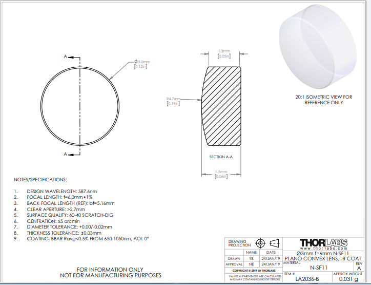 Thorlabs索雷博 LA2036-B 平凸透镜
