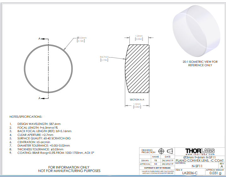 Thorlabs索雷博 LA2036-C 平凸透镜
