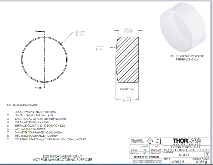 Thorlabs索雷博 LA2039-B 平凸透镜