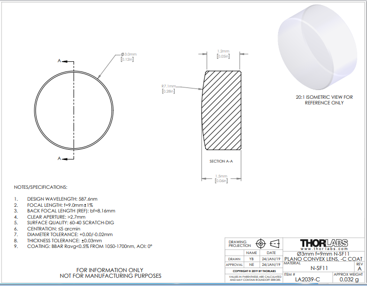 Thorlabs索雷博     LA2039-C   平凸透镜