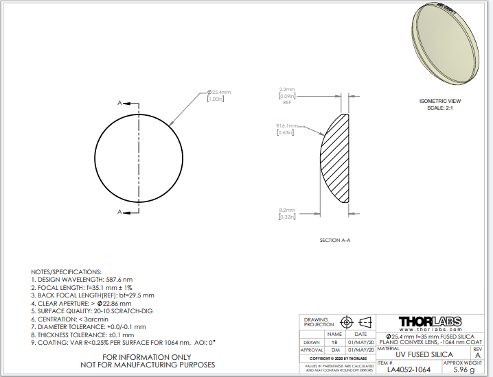 Thorlabs索雷博 LA4052-1064 平凸透镜
