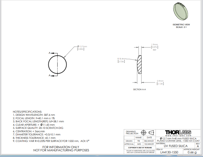 Thorlabs索雷博     LA4130-1550   平凸透镜