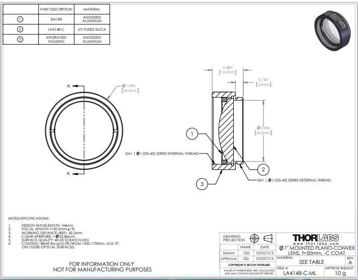 Thorlabs索雷博 LA4148-C-ML 平凸透镜