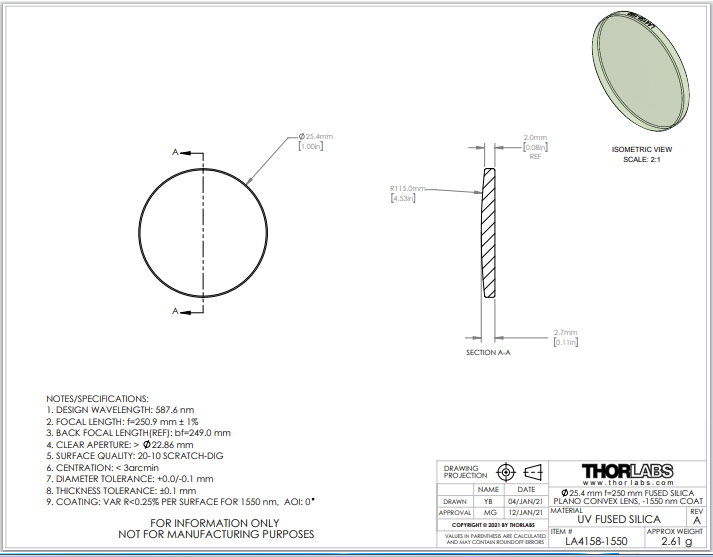 Thorlabs索雷博 LA4158-1550 平凸透镜