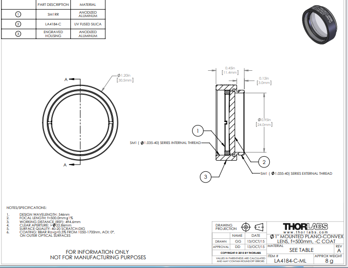 Thorlabs索雷博 LA4184-C-ML 平凸透镜