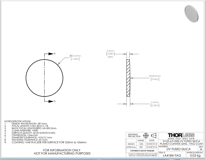 Thorlabs索雷博 LA4184-YAG 平凸透镜