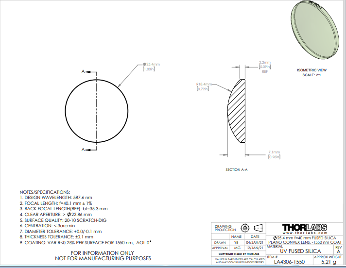 Thorlabs索雷博 LA4306-1550 平凸透镜