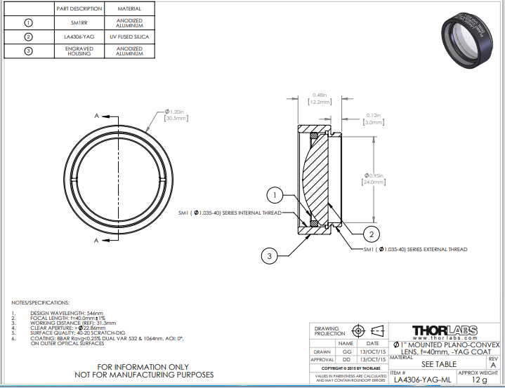 Thorlabs索雷博 LA4306-YAG-ML 平凸透镜