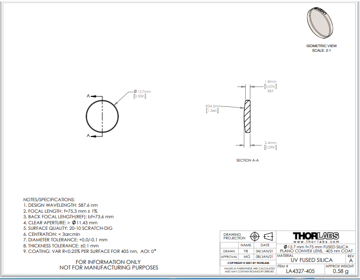 Thorlabs索雷博 LA4327-405 平凸透镜