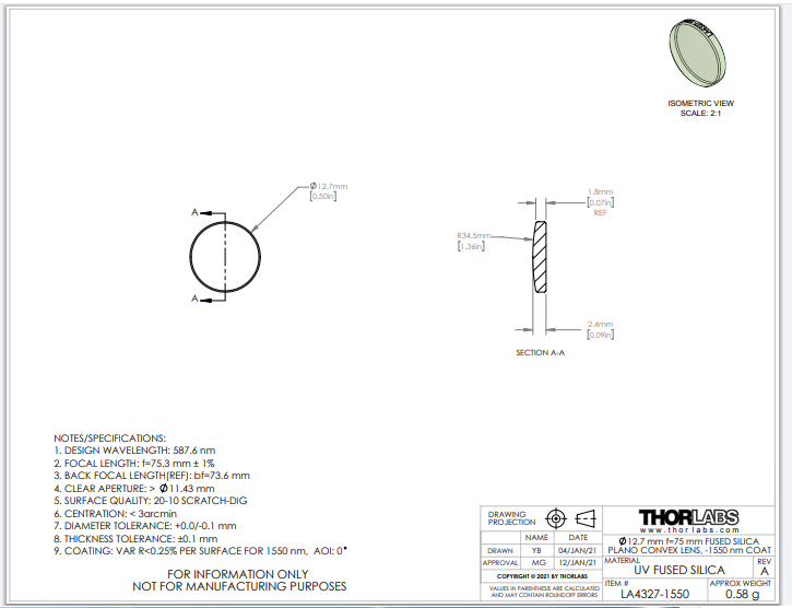 Thorlabs索雷博 LA4327-1550 平凸透镜