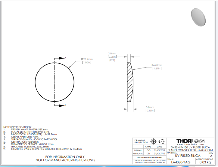 Thorlabs索雷博 LA4380-YAG 平凸透镜