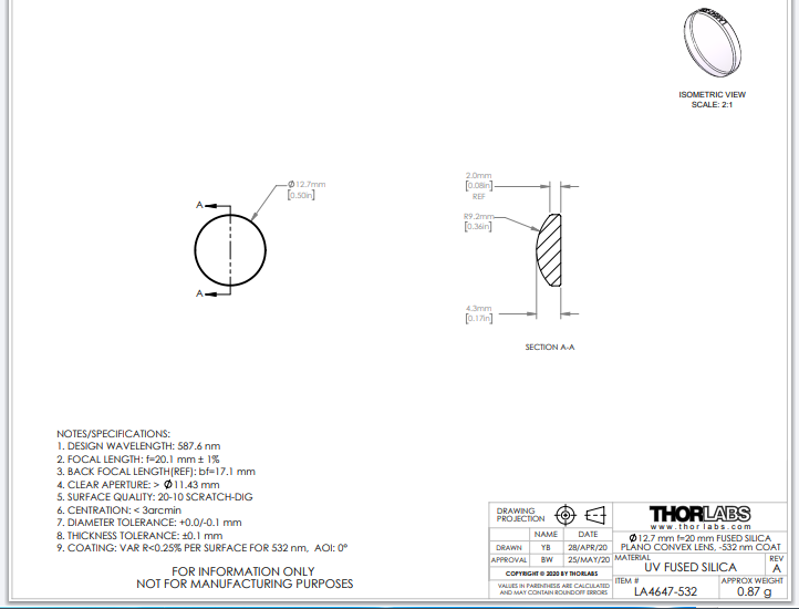 Thorlabs索雷博     LA4647-532   平凸透镜