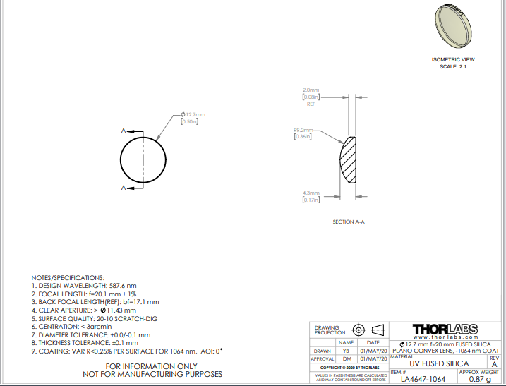 Thorlabs索雷博 LA4647-1064 平凸透镜