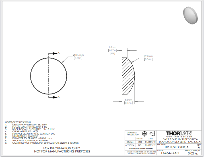 Thorlabs索雷博     LA4647-YAG   平凸透镜