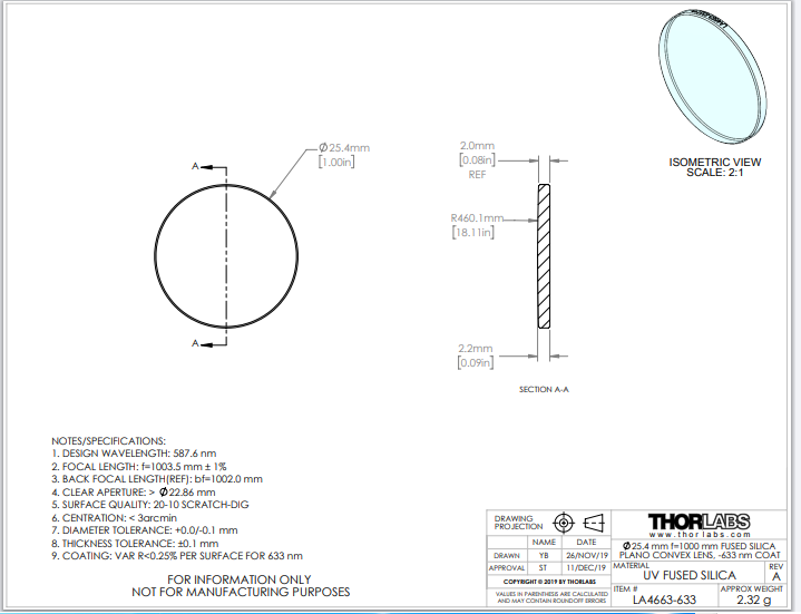 Thorlabs索雷博 LA4663-633 平凸透镜