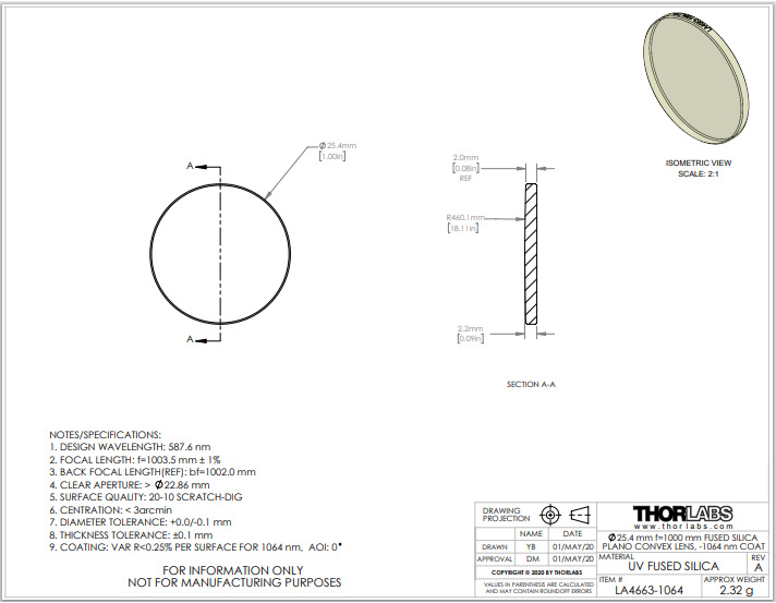 Thorlabs索雷博     LA4663-1064   平凸透镜