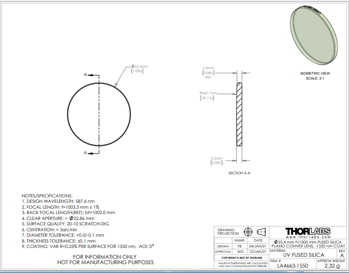 Thorlabs索雷博     LA4663-1550   平凸透镜
