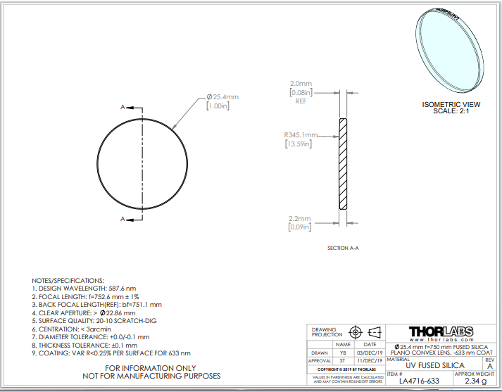 Thorlabs索雷博 LA4716-633 平凸透镜