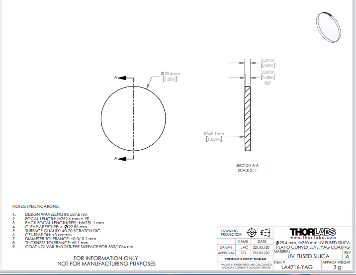 Thorlabs索雷博 LA4716-YAG 平凸透镜