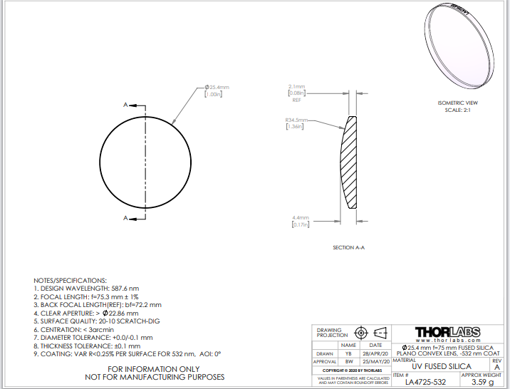 Thorlabs索雷博 LA4725-532 平凸透镜