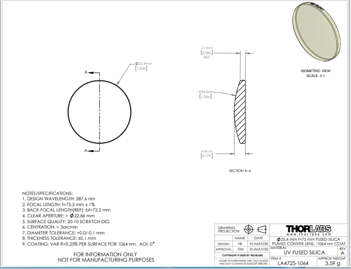 Thorlabs索雷博 LA4725-1064 平凸透镜