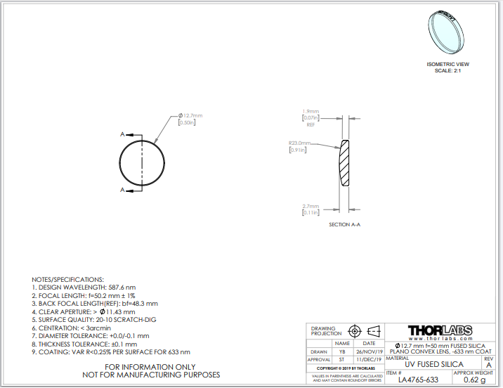 Thorlabs索雷博 LA4765-633 平凸透镜