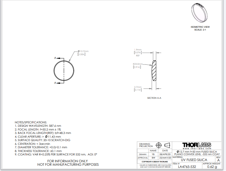 Thorlabs索雷博 LA4765-532 平凸透镜