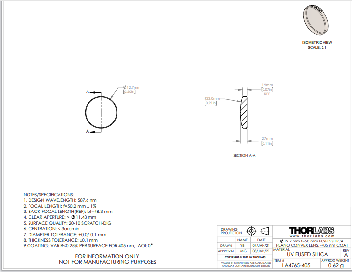Thorlabs索雷博     LA4765-405   平凸透镜