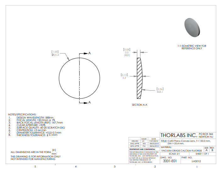 Thorlabs索雷博 LA5012 平凸透镜