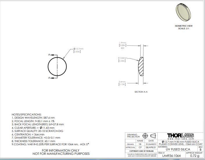 Thorlabs索雷博 LA4936-1064 平凸透镜
