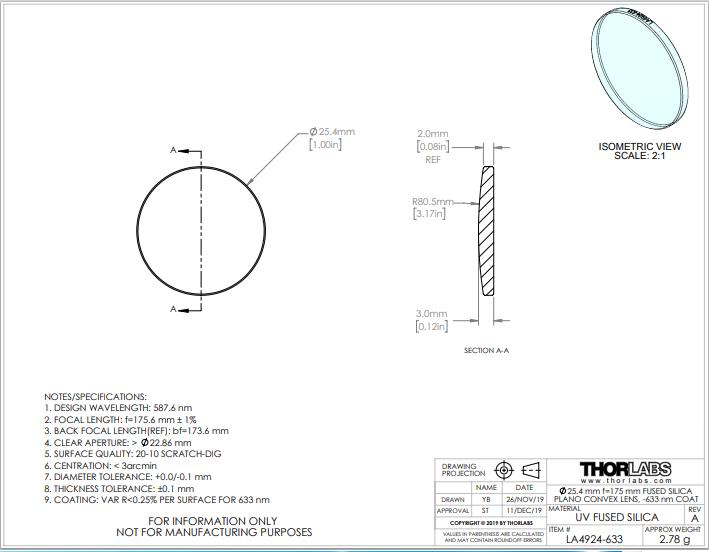 Thorlabs索雷博 LA4924-633 平凸透镜