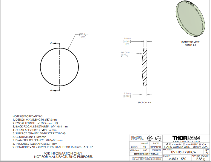 Thorlabs索雷博     LA4874-1550   平凸透镜