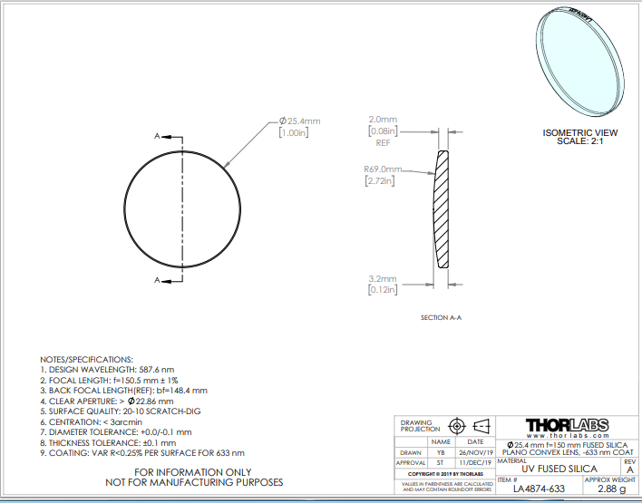Thorlabs索雷博 LA4874-633 平凸透镜