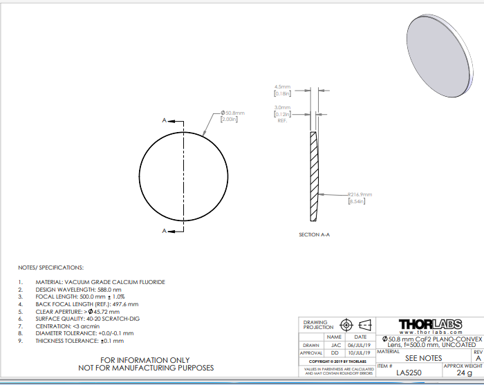 Thorlabs索雷博 LA5250 平凸透镜