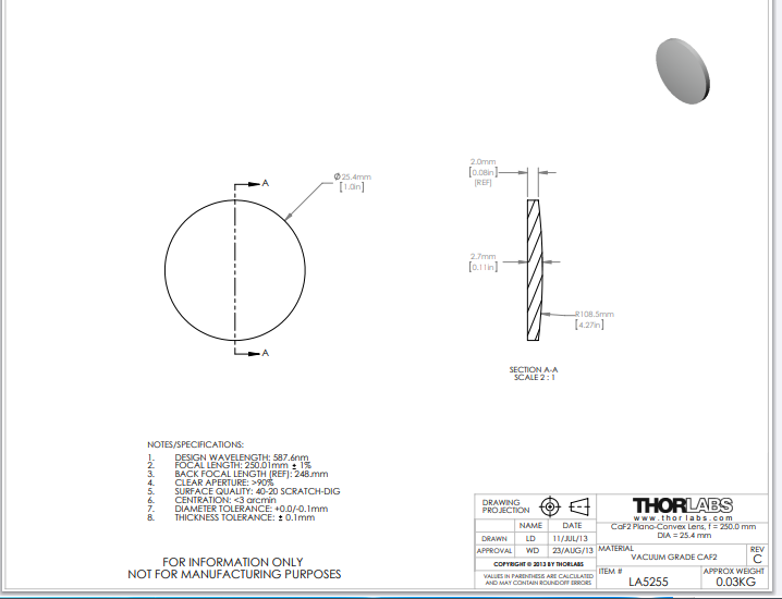 Thorlabs索雷博 LA5255 平凸透镜