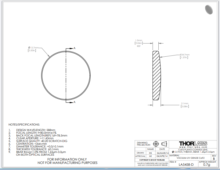 Thorlabs索雷博     LA5458-D   平凸透镜