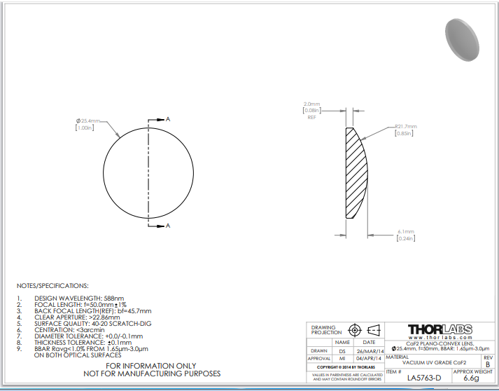 Thorlabs索雷博 LA5763-D 平凸透镜