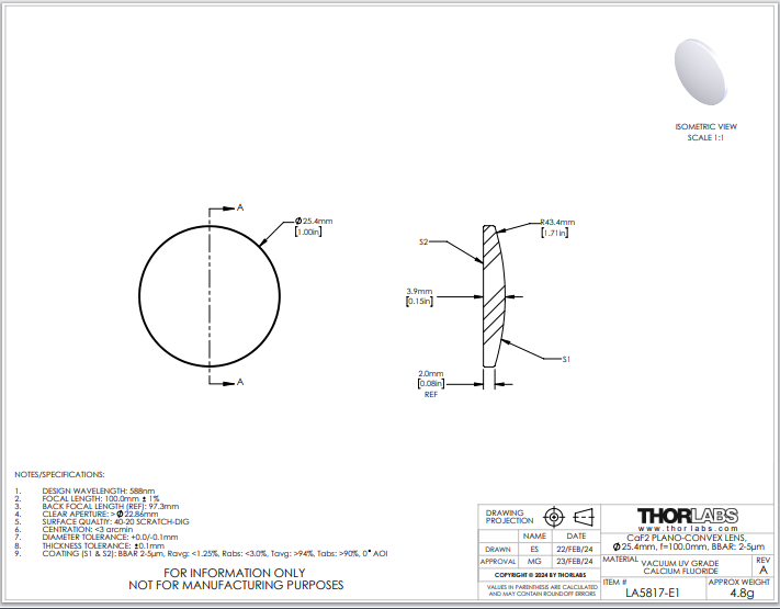 Thorlabs索雷博     LA5817-E1   平凸透镜