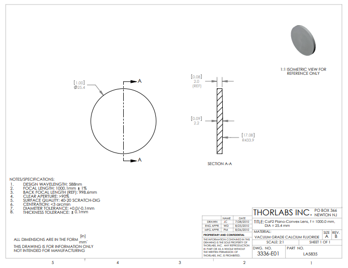 Thorlabs索雷博 LA5835 平凸透镜