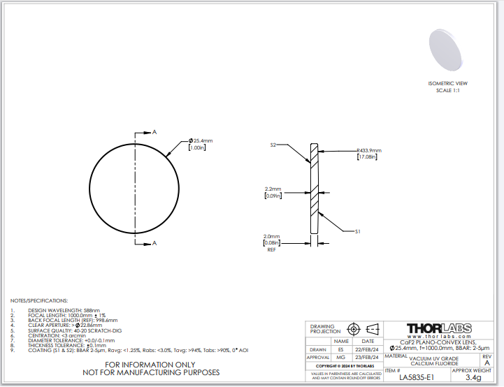 Thorlabs索雷博 LA5835-E1 平凸透镜