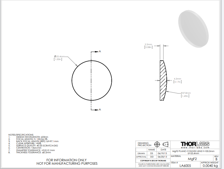 Thorlabs索雷博 LA6005 平凸透镜