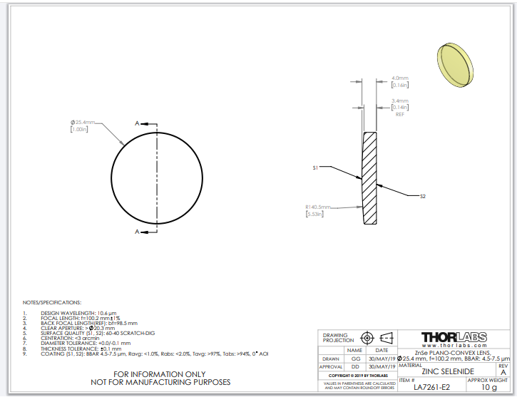 Thorlabs索雷博 LA7261-E2 平凸透镜