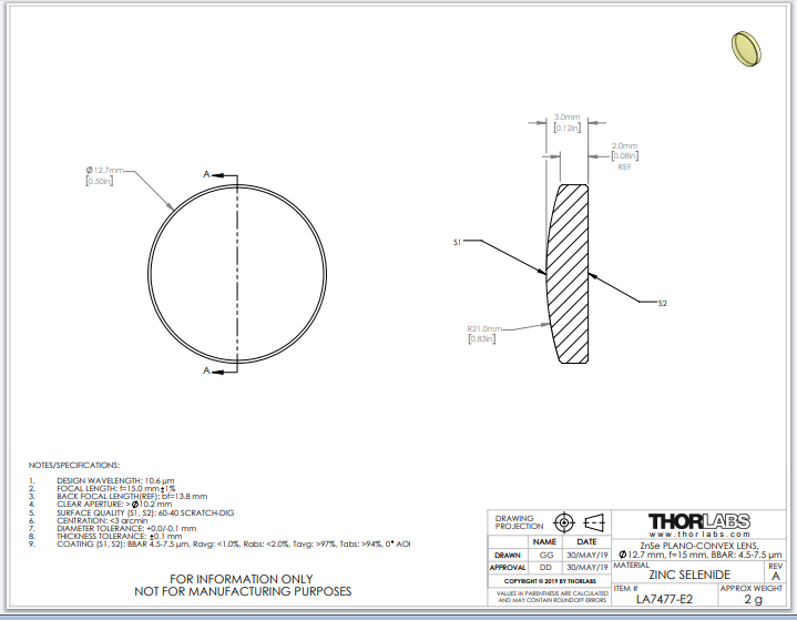 Thorlabs索雷博 LA7477-E2 平凸透镜