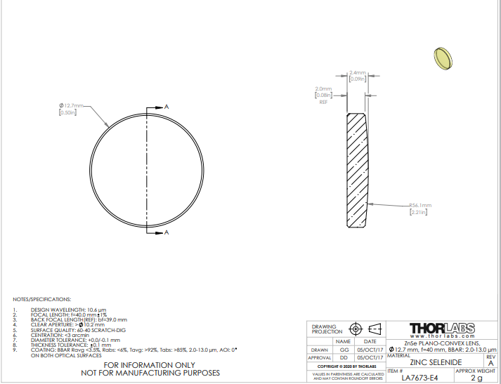 Thorlabs索雷博 LA7673-E4 平凸透镜
