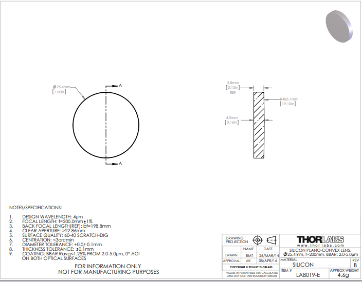 Thorlabs索雷博 LA8019-E 平凸透镜