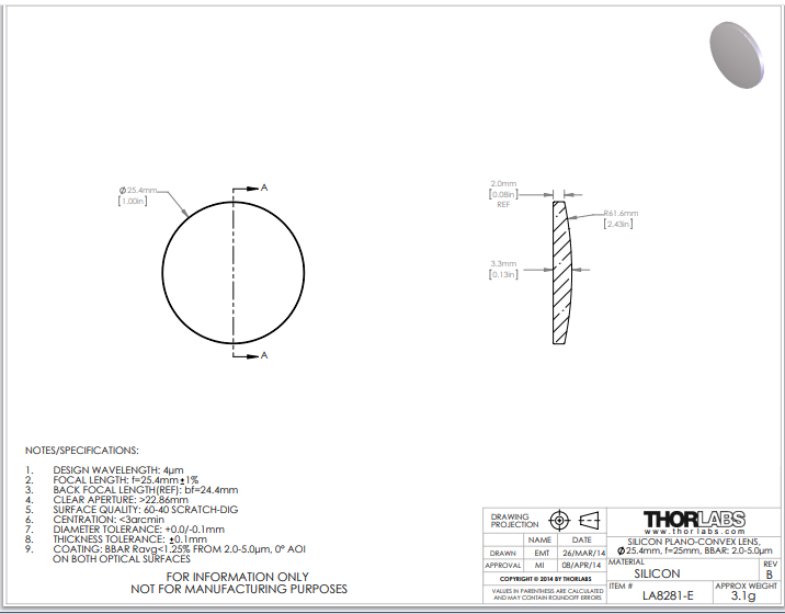 Thorlabs索雷博 LA8281-E 平凸透镜