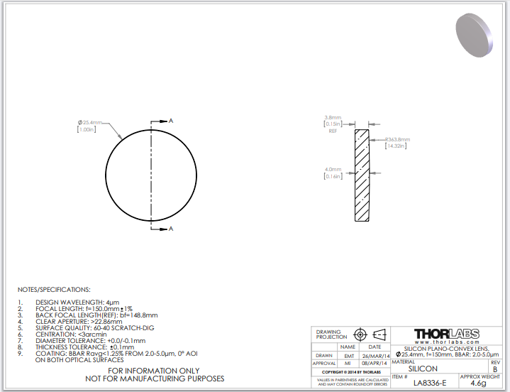 Thorlabs索雷博 LA8336-E 平凸透镜