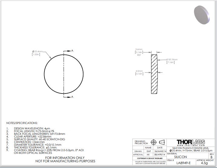 Thorlabs索雷博 LA8949-E 平凸透镜
