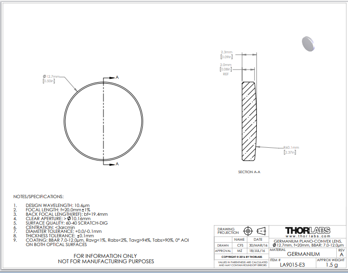 Thorlabs索雷博 LA9015-E3 平凸透镜