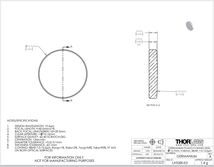 Thorlabs索雷博 LA9280-E3 平凸透镜